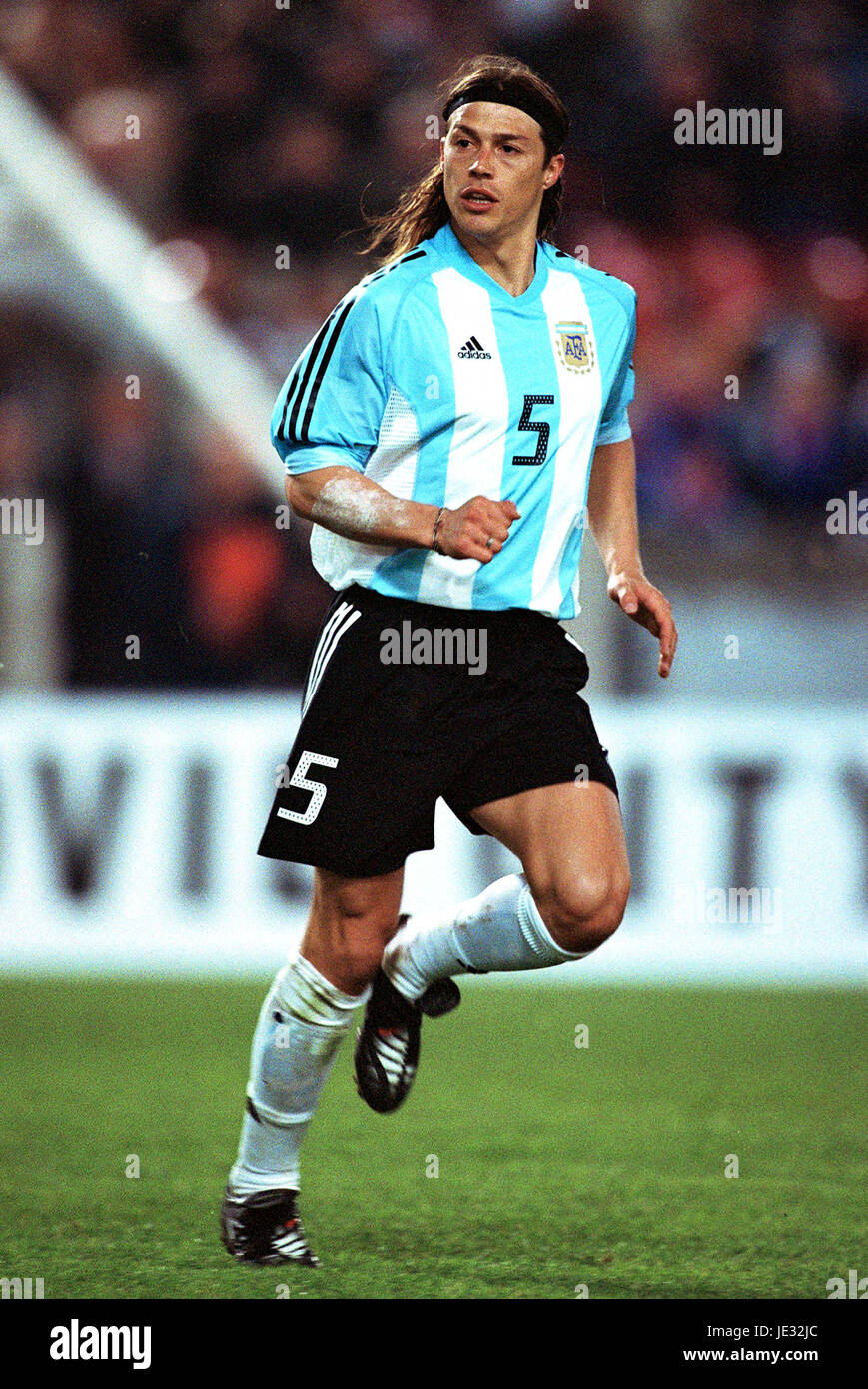 Matias almeyda of argentina is tackled by anders svensson of sweden during the group f match of the world cup group stage played at the miyagi stadium, miyagi, japan on june 12, 2002.